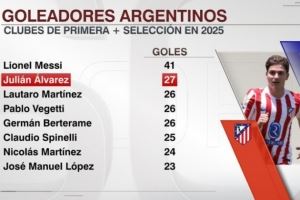 进入2025年,阿尔瓦雷斯在俱乐部和国家队已打进27球,阿根廷球员中仅次于梅西的41球。在阿尔瓦雷斯身后是劳塔罗(26球)、维格蒂(26球)、贝尔泰拉梅(26球)、斯皮内利(25球)、尼古拉斯-马丁内斯(24球)以及何塞-洛佩斯(23球)。